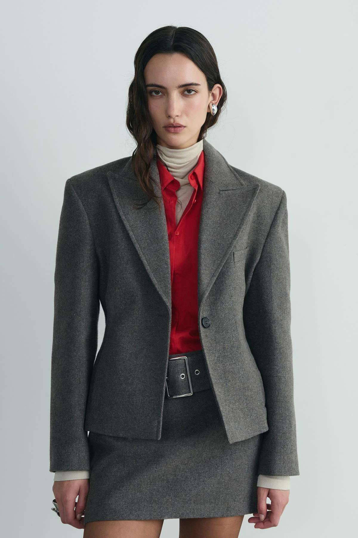Blair Ceket, vatkalı tasarımı ve geniş yakasıyla iddialı bir görünüm oluşturmanı sağlar. Kaşe dokusu soğuk havalarda sıcak tutarken, düğme detayı ve kesimiyle şehir hayatının temposuna zahmetsizce uyum sağlar. Görünümünü Blair Kemerli Kaşe Mini Etek ile tamamla.